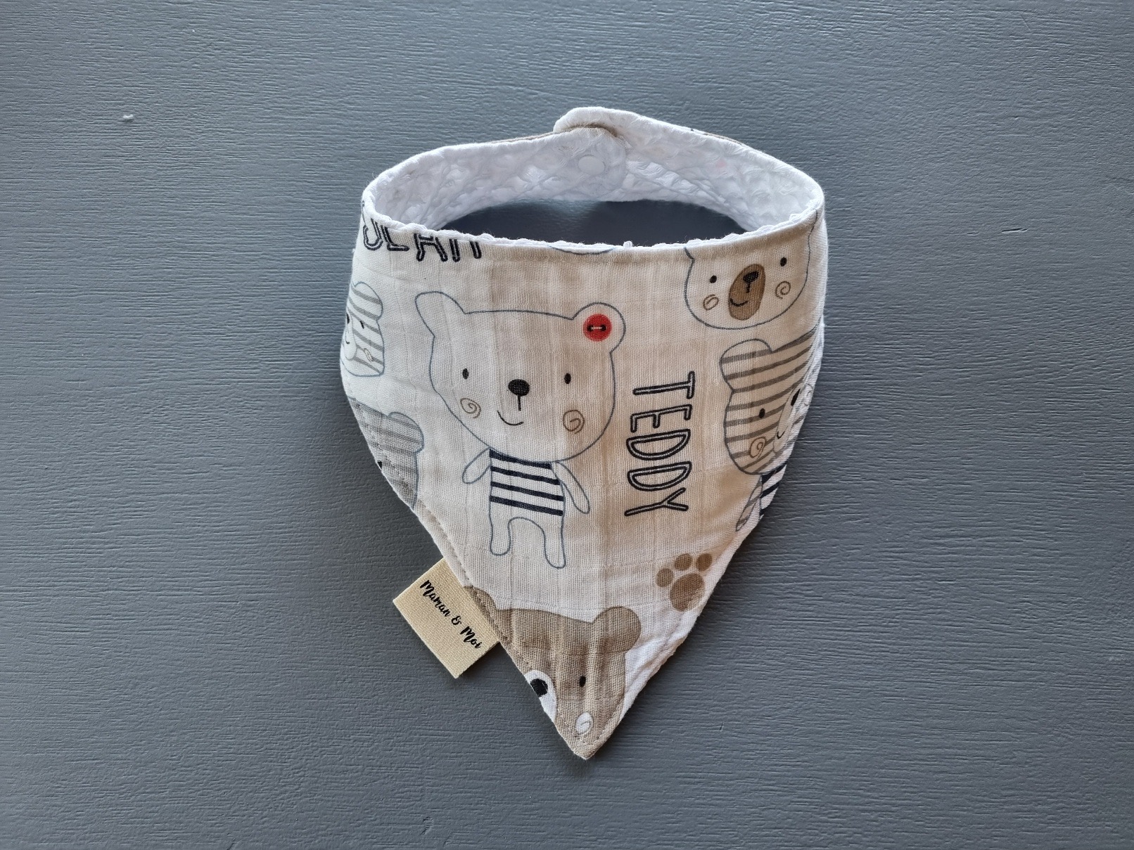 Our bibs come in three convenient sizes: Small (31x23cm), Medium (34x24cm), and Large (37x26cm).
