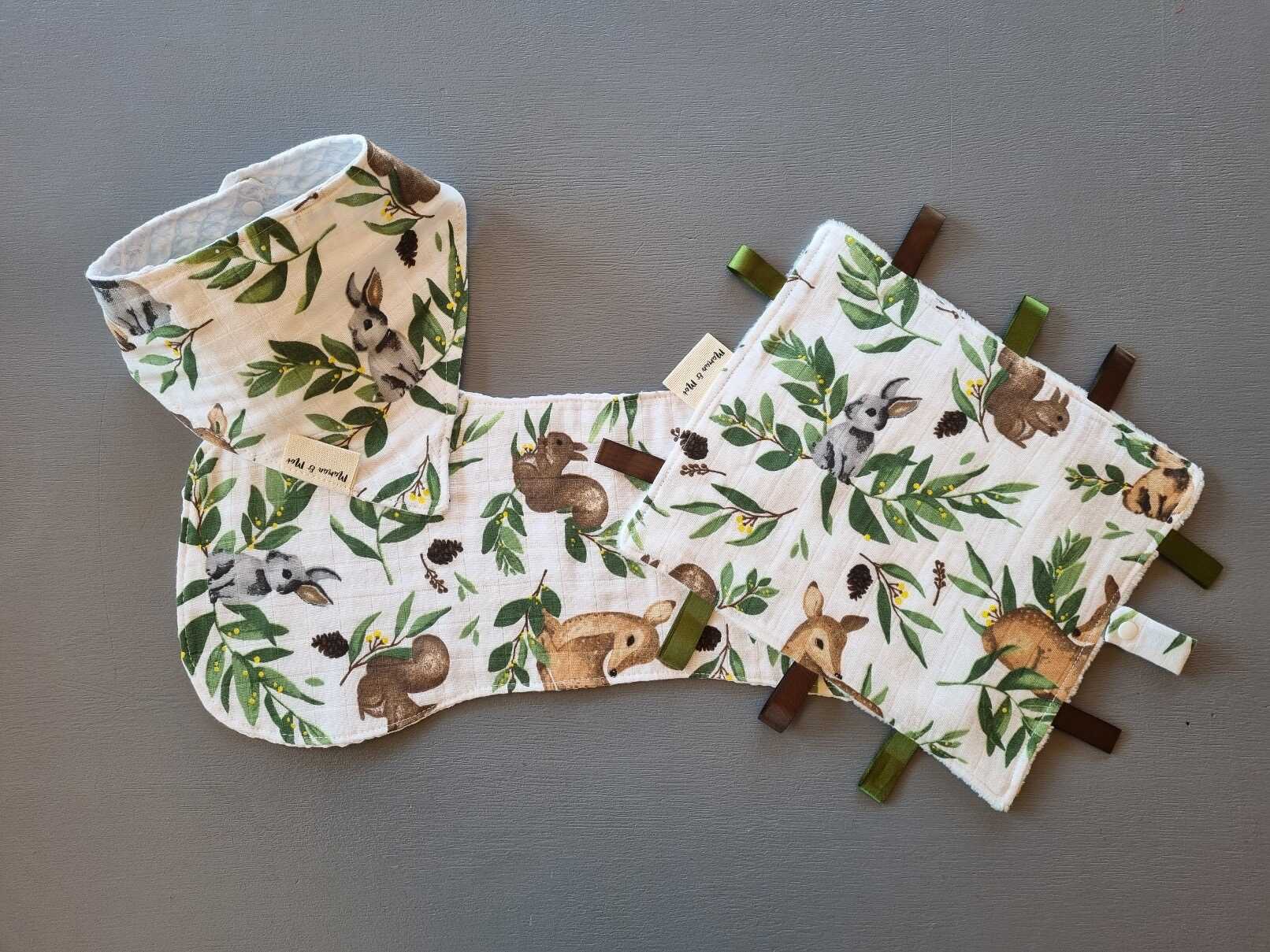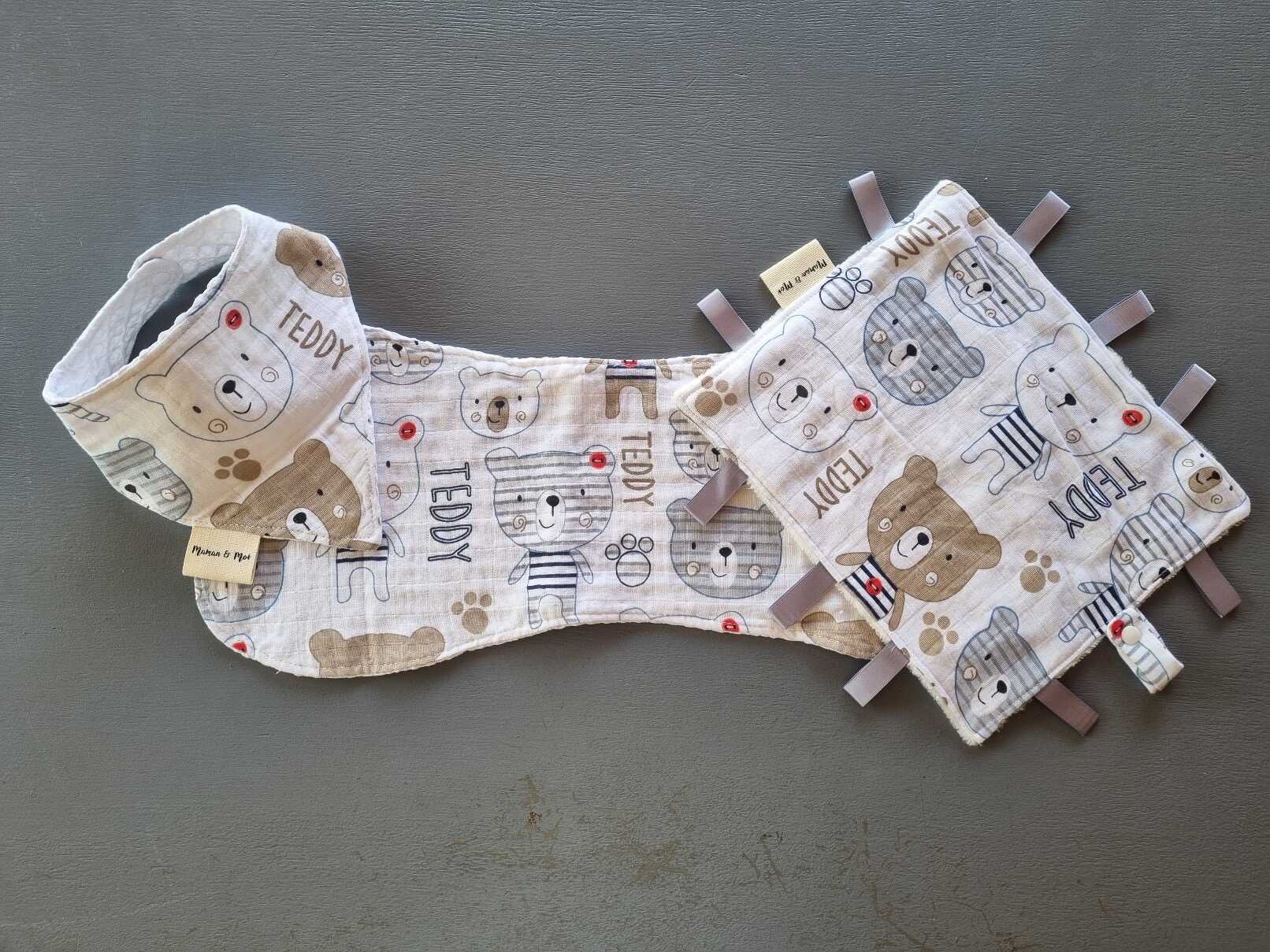 You’ll find our popular Doodootag (Taglet security blanket) in every set. Our Muslin selection includes a Doodootag, single burp cloth, and baby bib, with peepee teepees added for boys. Other sets may feature our absorbent V-shape bibs and soothing bunny teething rings.