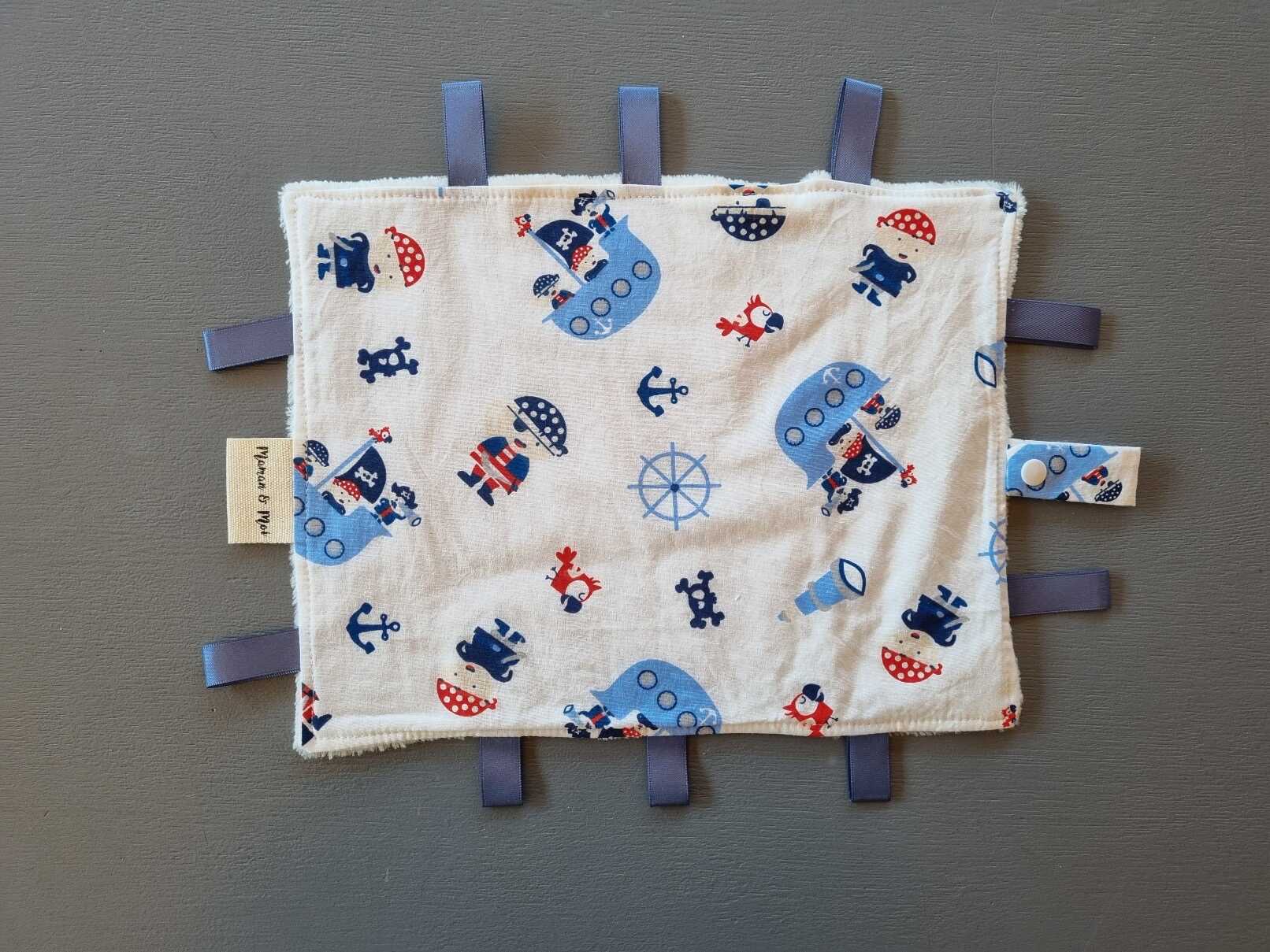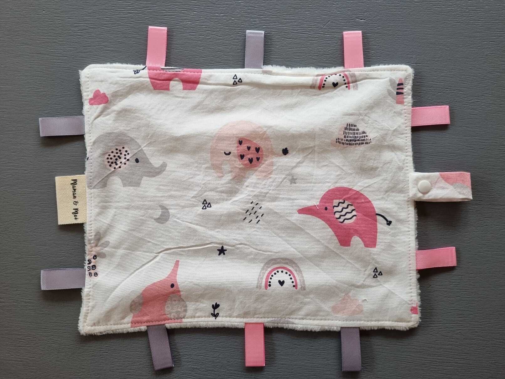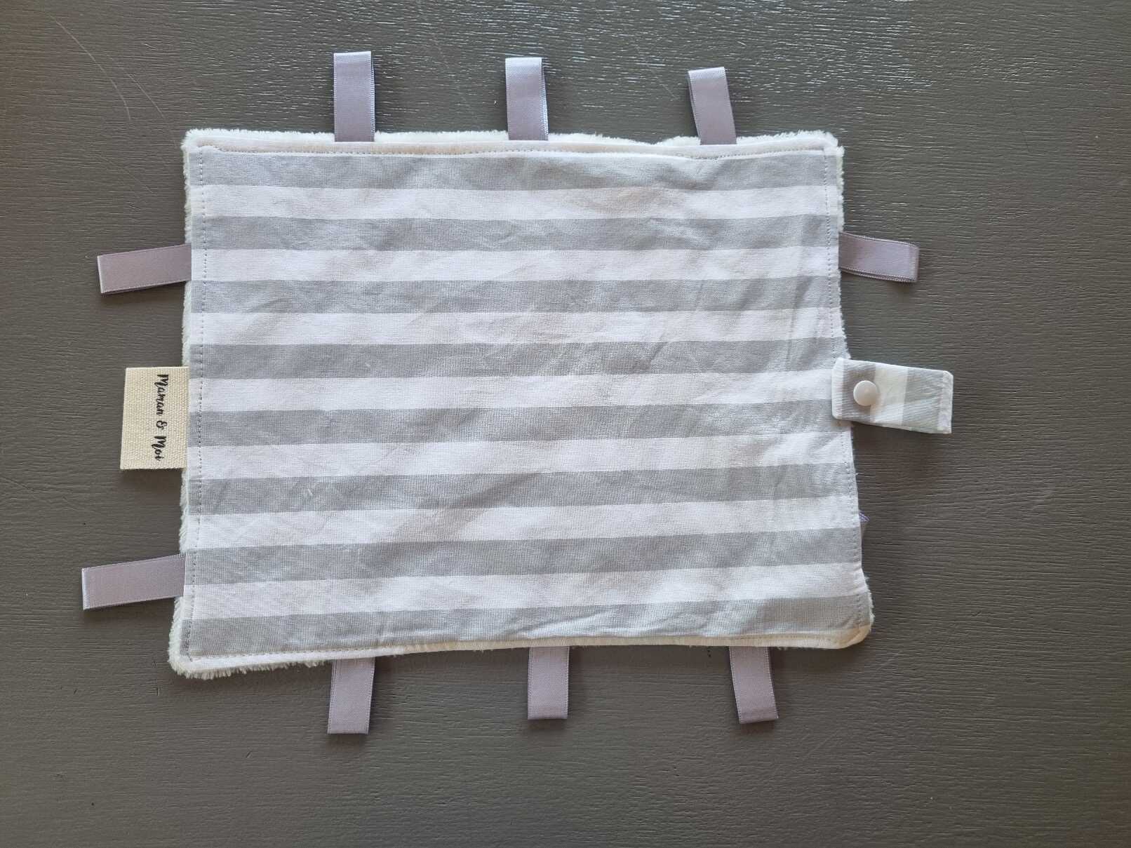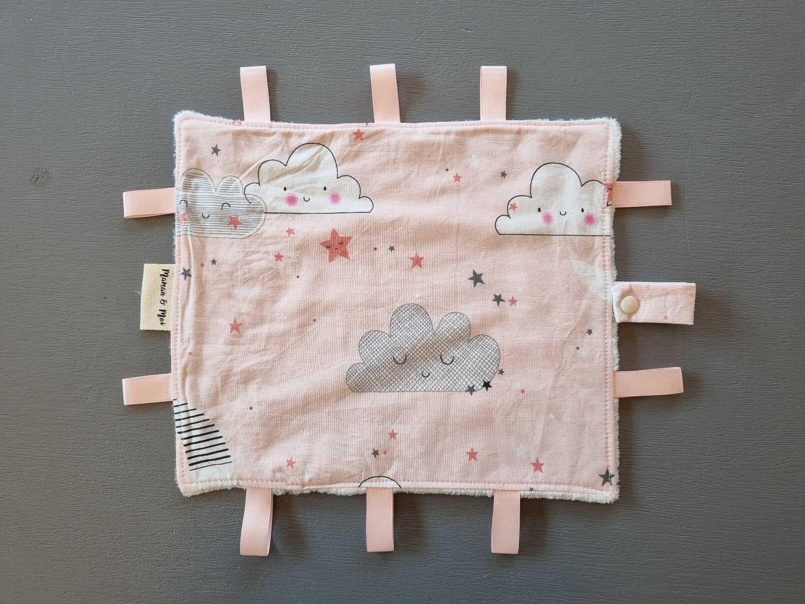 This comforting blanket features a built-in dummy clip and sensory ribbon tags all around for tactile exploration. Made with soft cotton, fleece material and durable satin or cotton ribbons, each blanket measures approximately 23x28cm. Perfect for soothing and stimulating little hands!