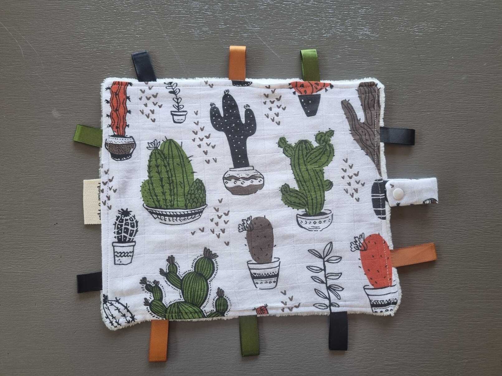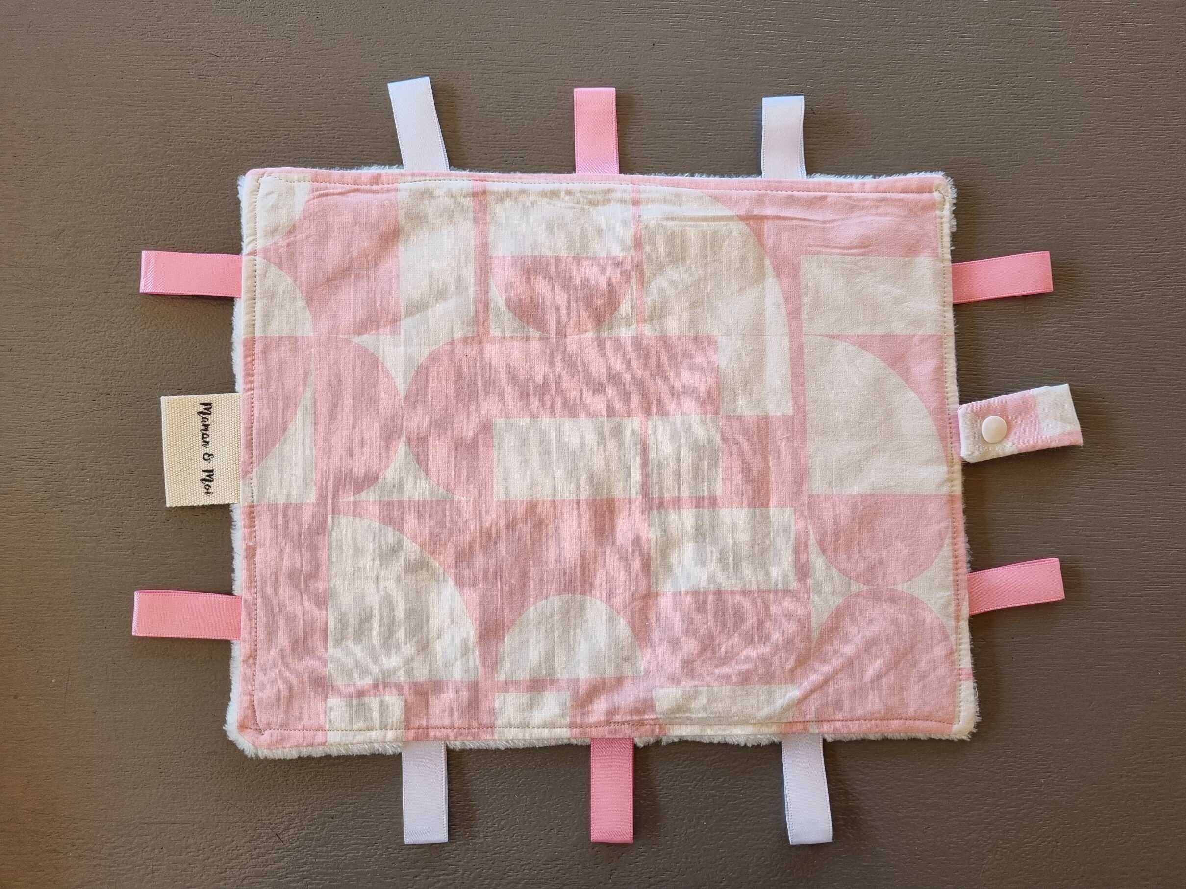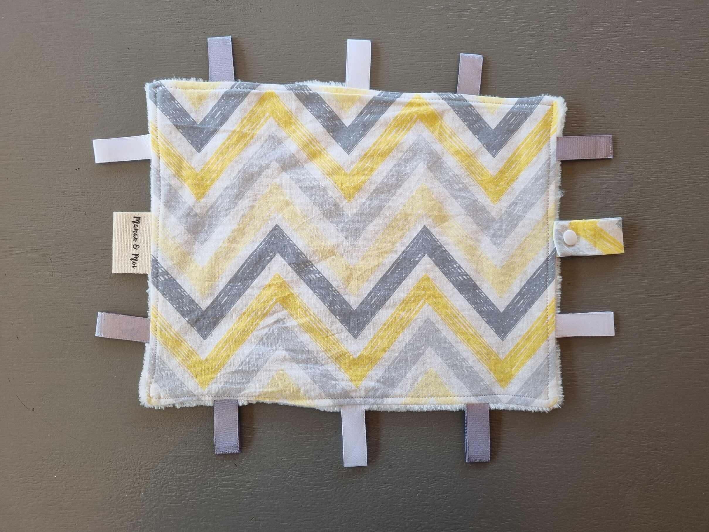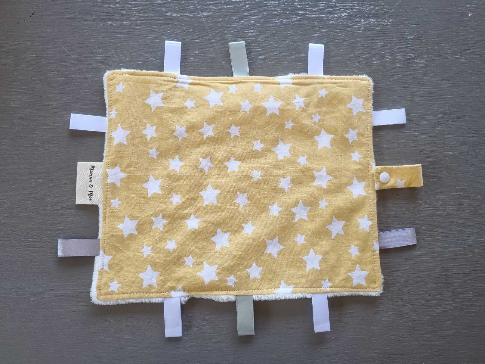 This comforting blanket features a built-in dummy clip and sensory ribbon tags all around for tactile exploration. Made with soft cotton, fleece material and durable satin or cotton ribbons, each blanket measures approximately 23x28cm. Perfect for soothing and stimulating little hands!